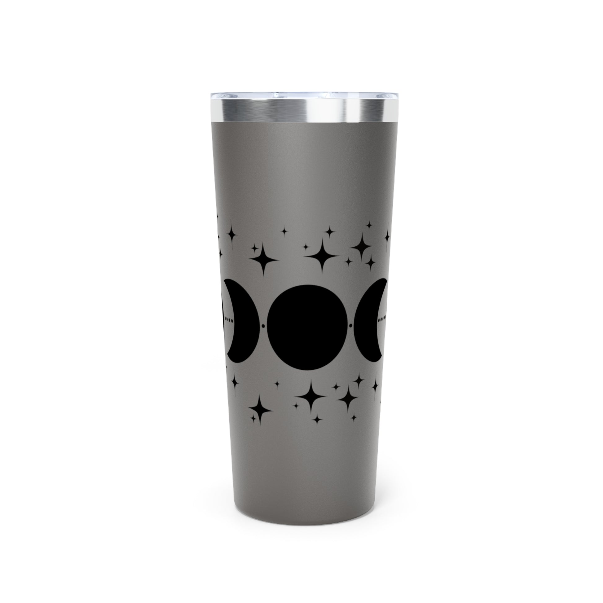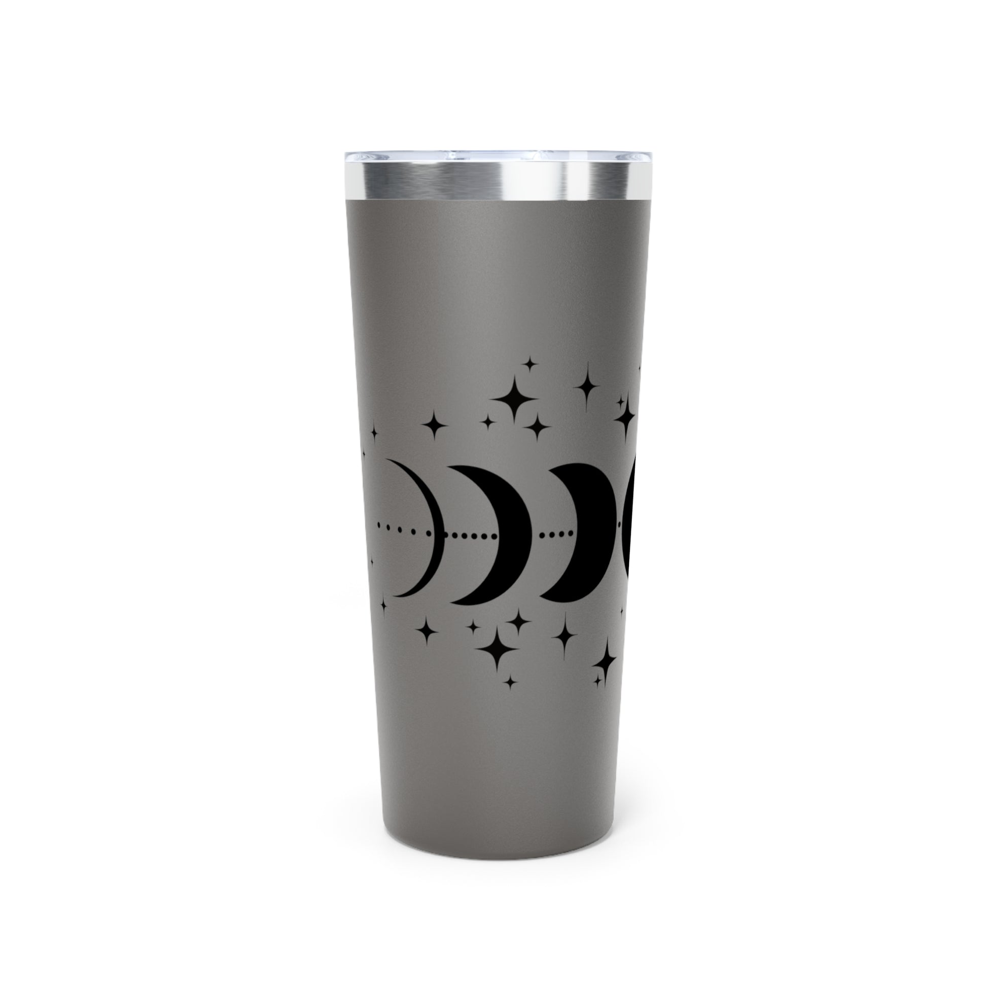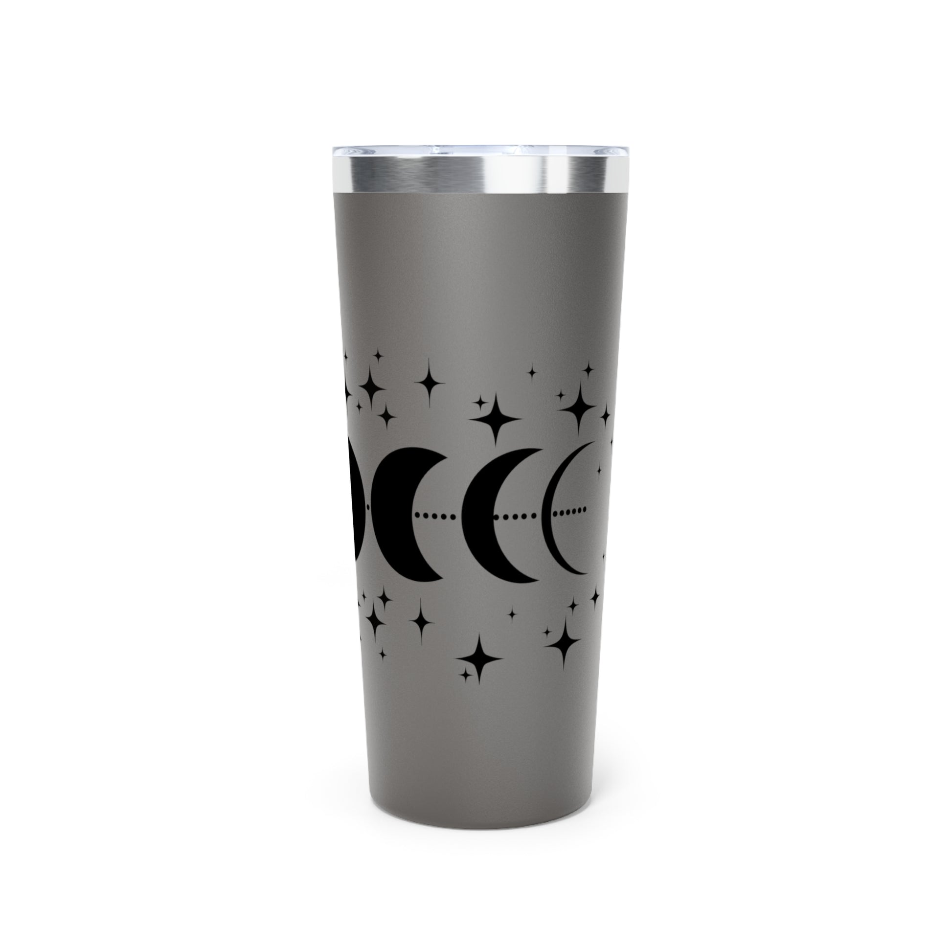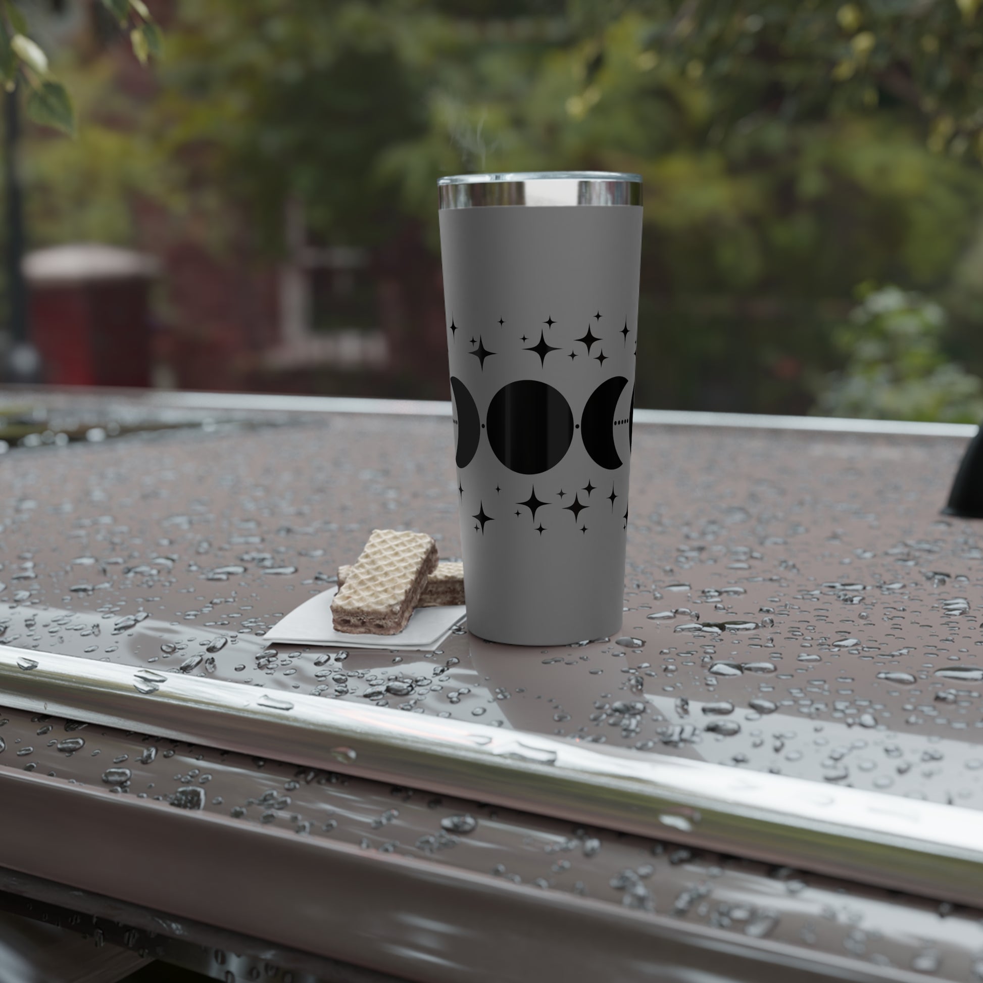 A sleek 22oz insulated tumbler wrapped in a subtle celestial design — crescent and full moons framed by tiny stars. It feels calm and a little mystical in the hand, with a matte powder-coated finish that reduces fingerprints and a clear push-on lid for easy sipping. Warm drinks stay hot for hours, iced drinks stay cold all day, and the outside stays dry. This is for people who love slow mornings, night-sky rituals, or carrying a little bit of moonlight with them on the go.