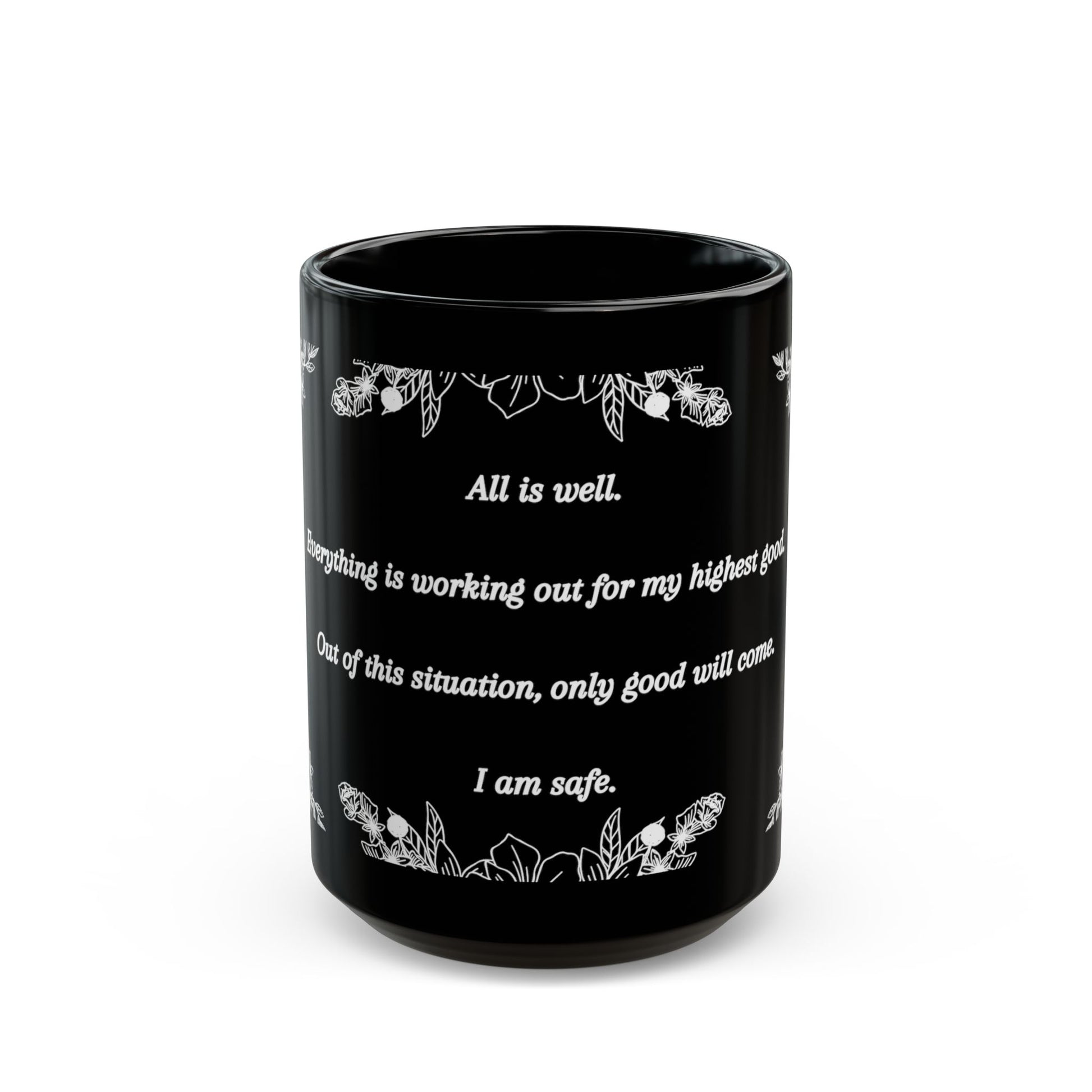 Affirmation Black Mug — 'All is well. I am safe.' Floral Inspirational Coffee Cup (11oz/15oz)