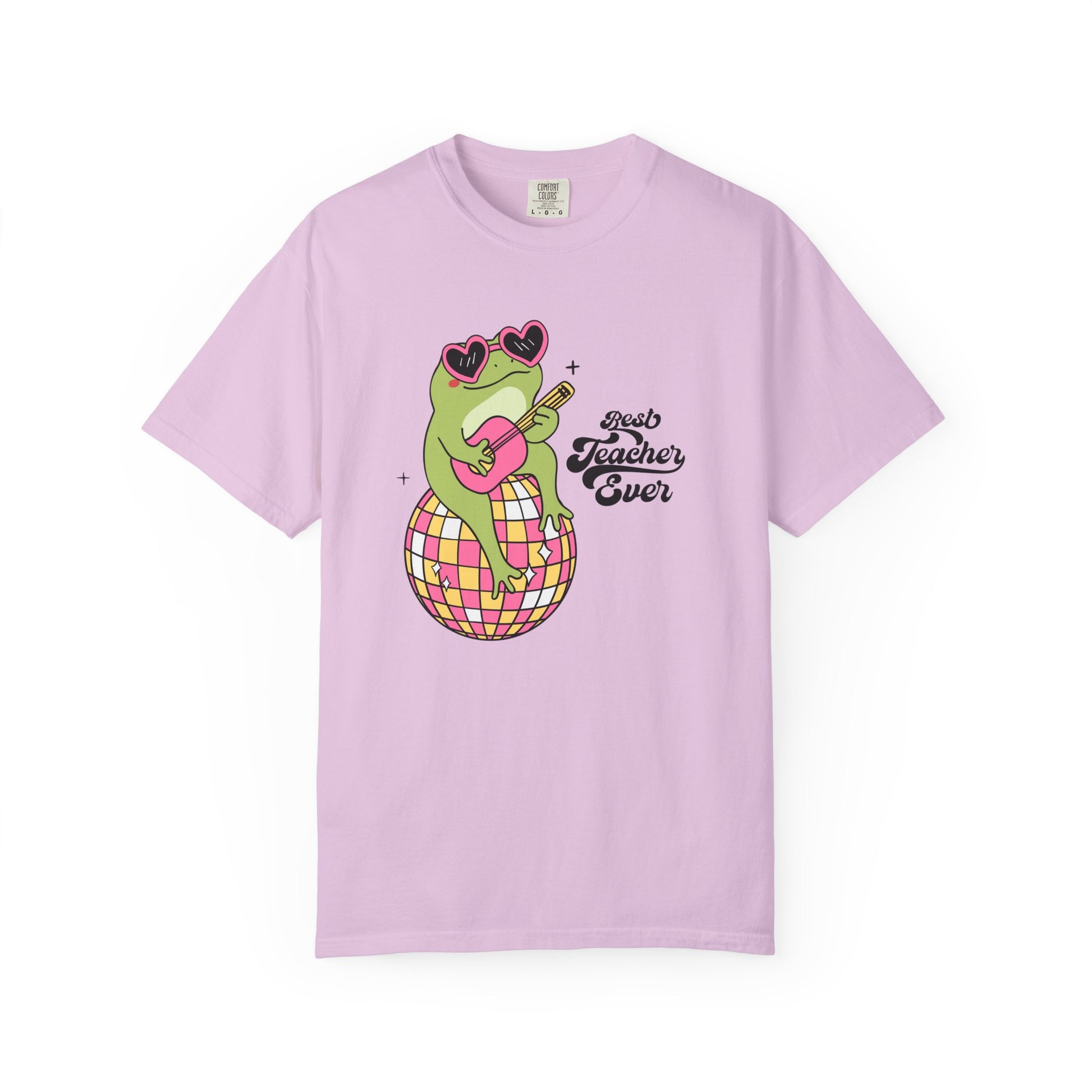 This heavyweight garment-dyed tee carries a playful, retro vibe — a relaxed-fit shirt that feels lived-in from the first wear. The soft, pre-shrunk ring-spun cotton and garment-dyed finish give the fabric gentle color depth and a broken-in hand. The front print shows a cheerful frog with heart-shaped sunglasses strumming atop a colorful disco ball, with whimsical lettering that reads “Best Teacher Ever.” It’s the kind of shirt a teacher might pull on after a long day of lessons, field trips, and grading — something comfortable to wear while unwinding, meeting students’ families, or celebrating the end of the school year. The tubular, side-seam-free knit and double-needle stitching mean this tee holds its shape and color through many washes. Offered in a wide range of colors and sizes (S–4XL via select partners), it’s built to be a go-to casual layer for warm-weather classrooms, parent-teacher nights, or relaxed weekend gatherings with colleagues.