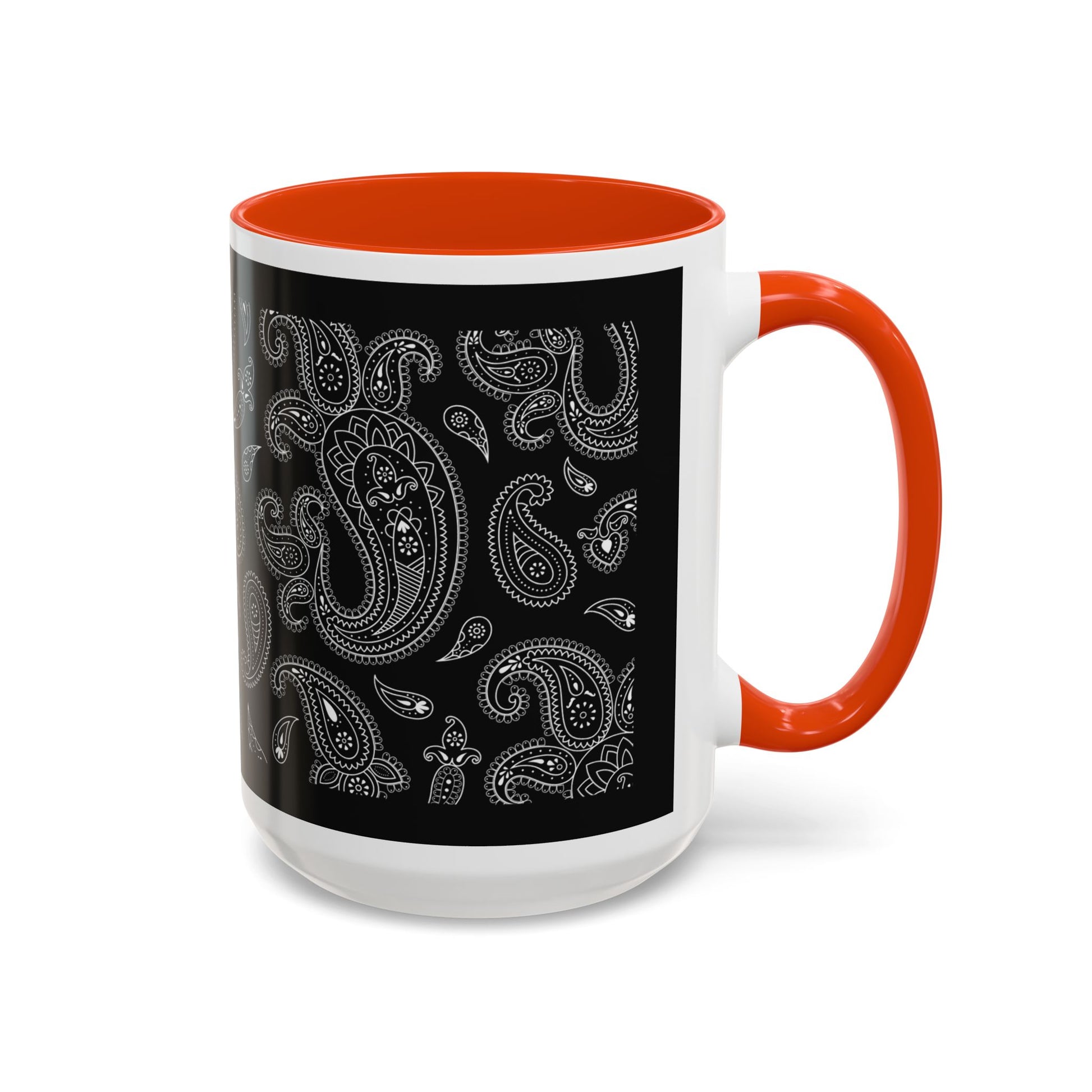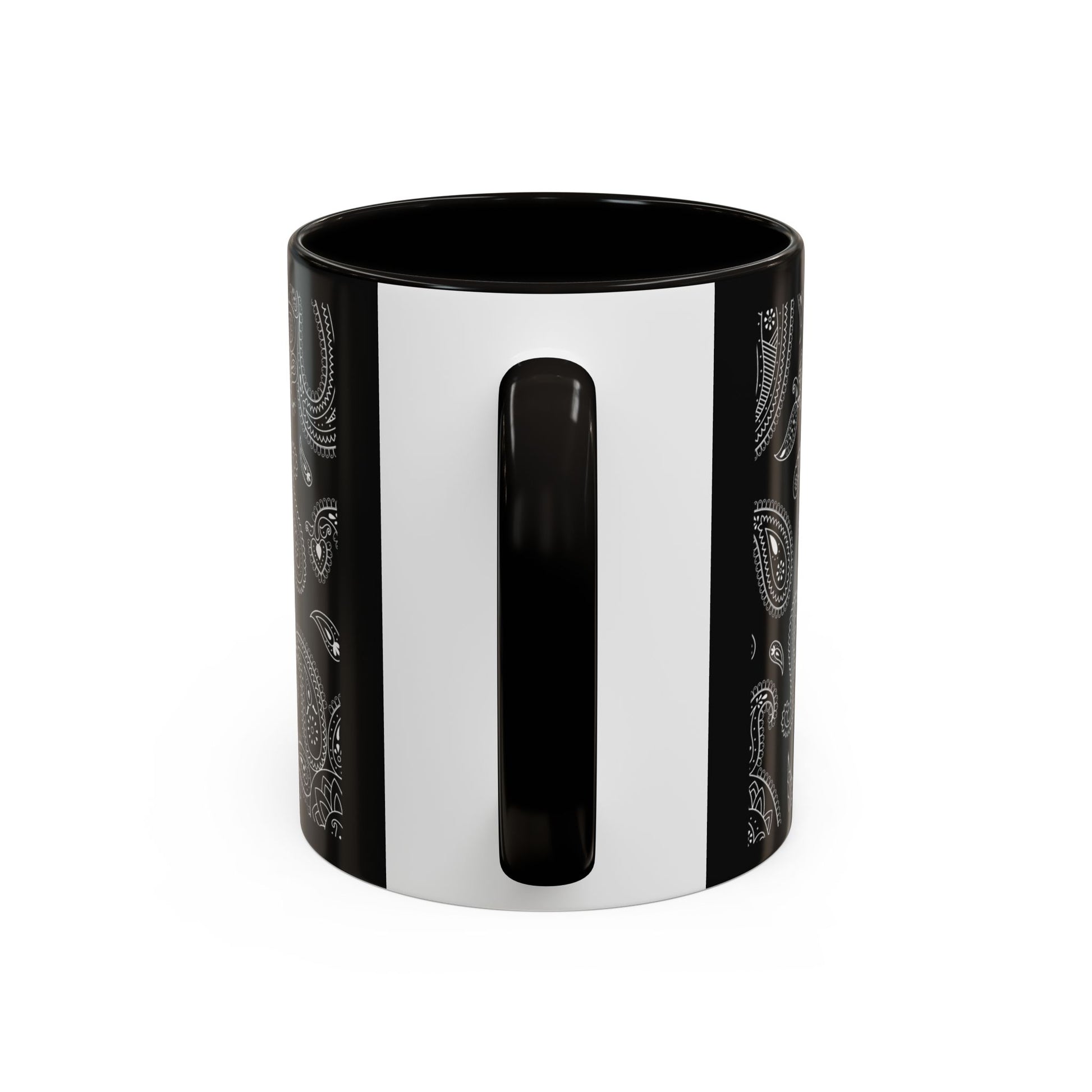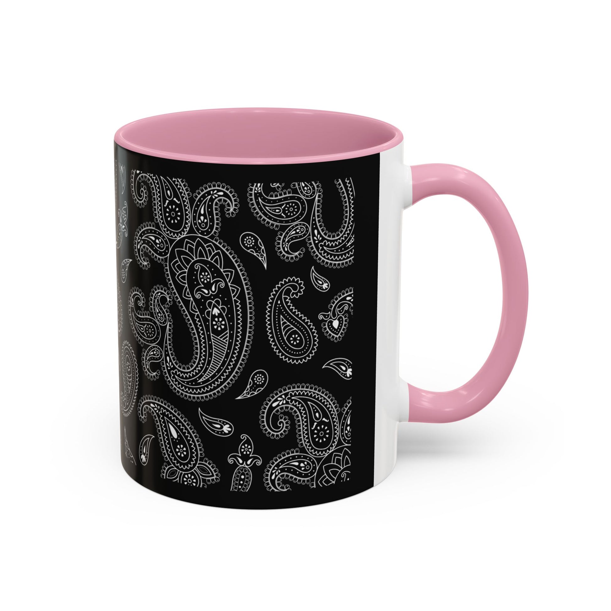 This glossy ceramic mug brings a quiet, stylish edge to everyday coffee and tea rituals. A deep black background is layered with intricate grayscale paisley, the pattern flowing around the mug like a whispered melody. The colored interior and C-shaped handle add a subtle pop that frames the design and feels comfortable in hand. It warms up early mornings, settles into late-night work sessions, and sits perfectly on a cluttered desk or a tidy shelf — a small, sophisticated pause in the middle of the day.