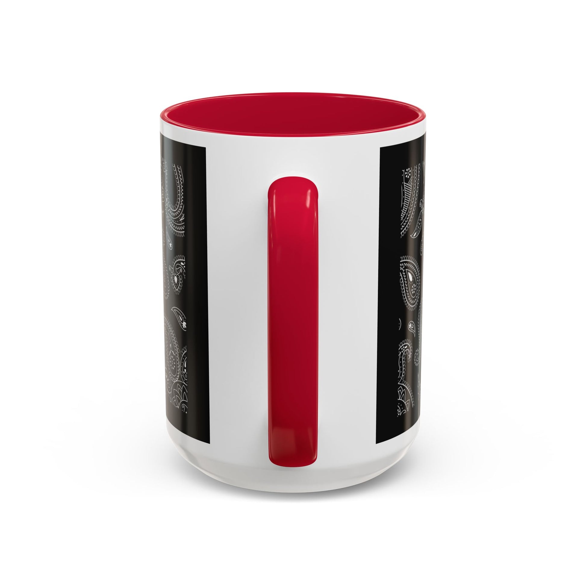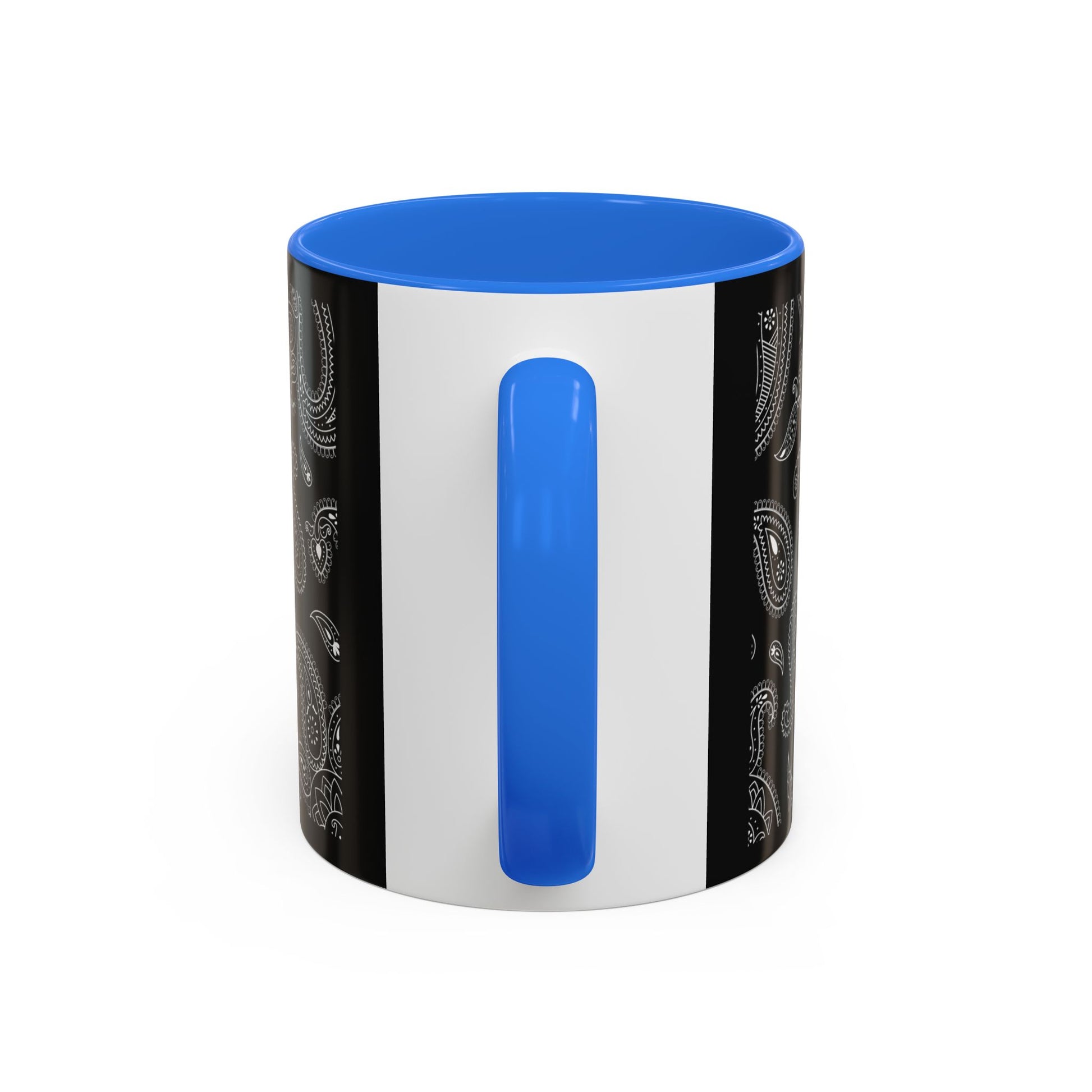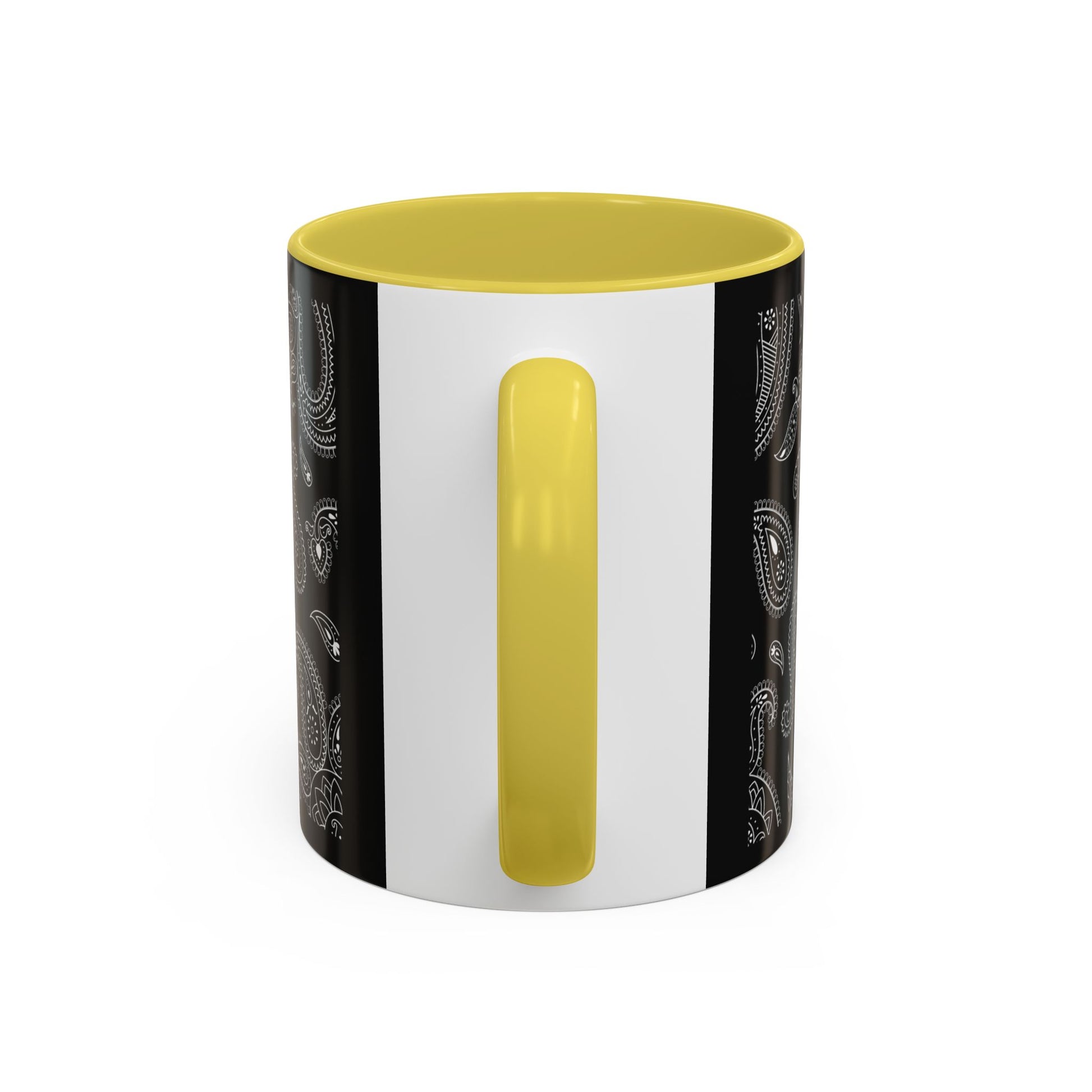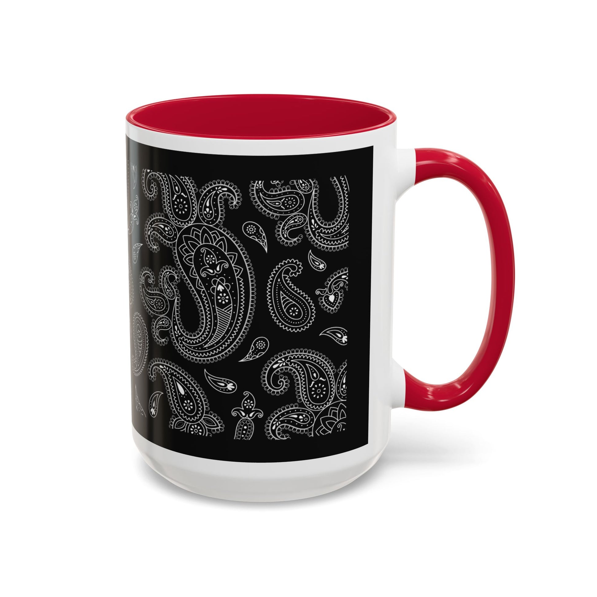 This glossy ceramic mug brings a quiet, stylish edge to everyday coffee and tea rituals. A deep black background is layered with intricate grayscale paisley, the pattern flowing around the mug like a whispered melody. The colored interior and C-shaped handle add a subtle pop that frames the design and feels comfortable in hand. It warms up early mornings, settles into late-night work sessions, and sits perfectly on a cluttered desk or a tidy shelf — a small, sophisticated pause in the middle of the day.