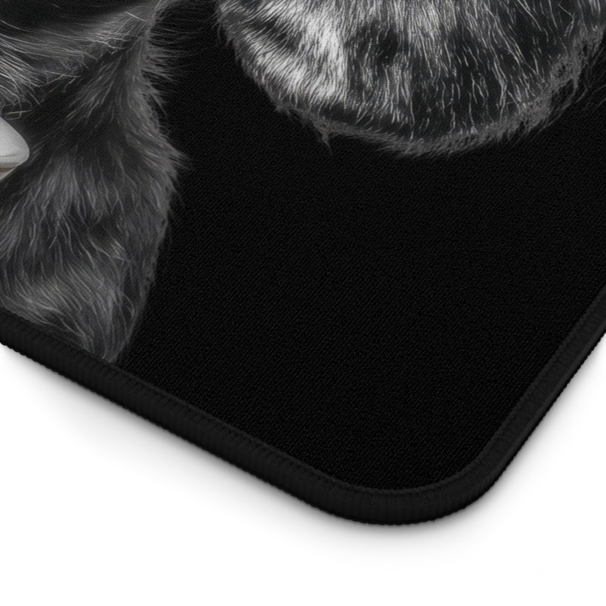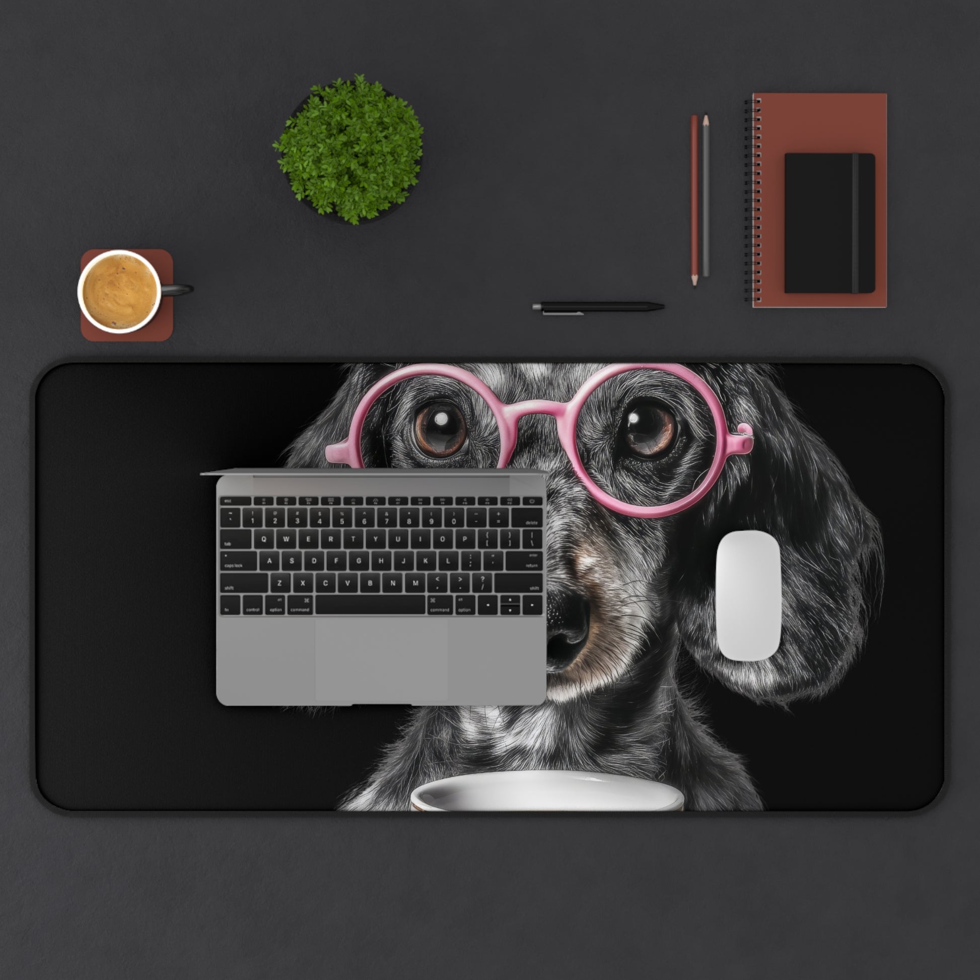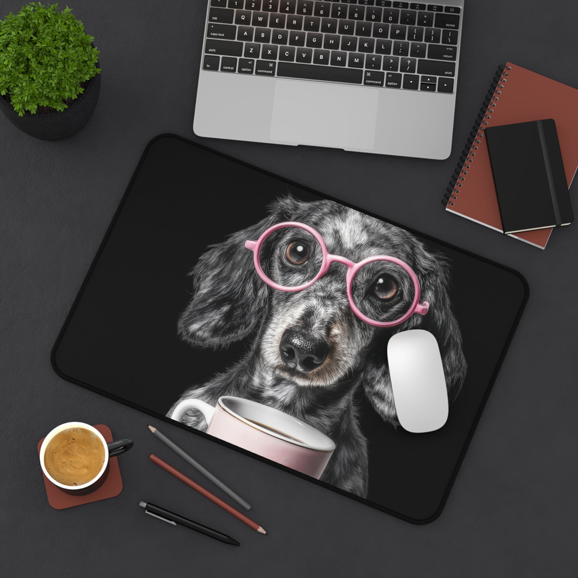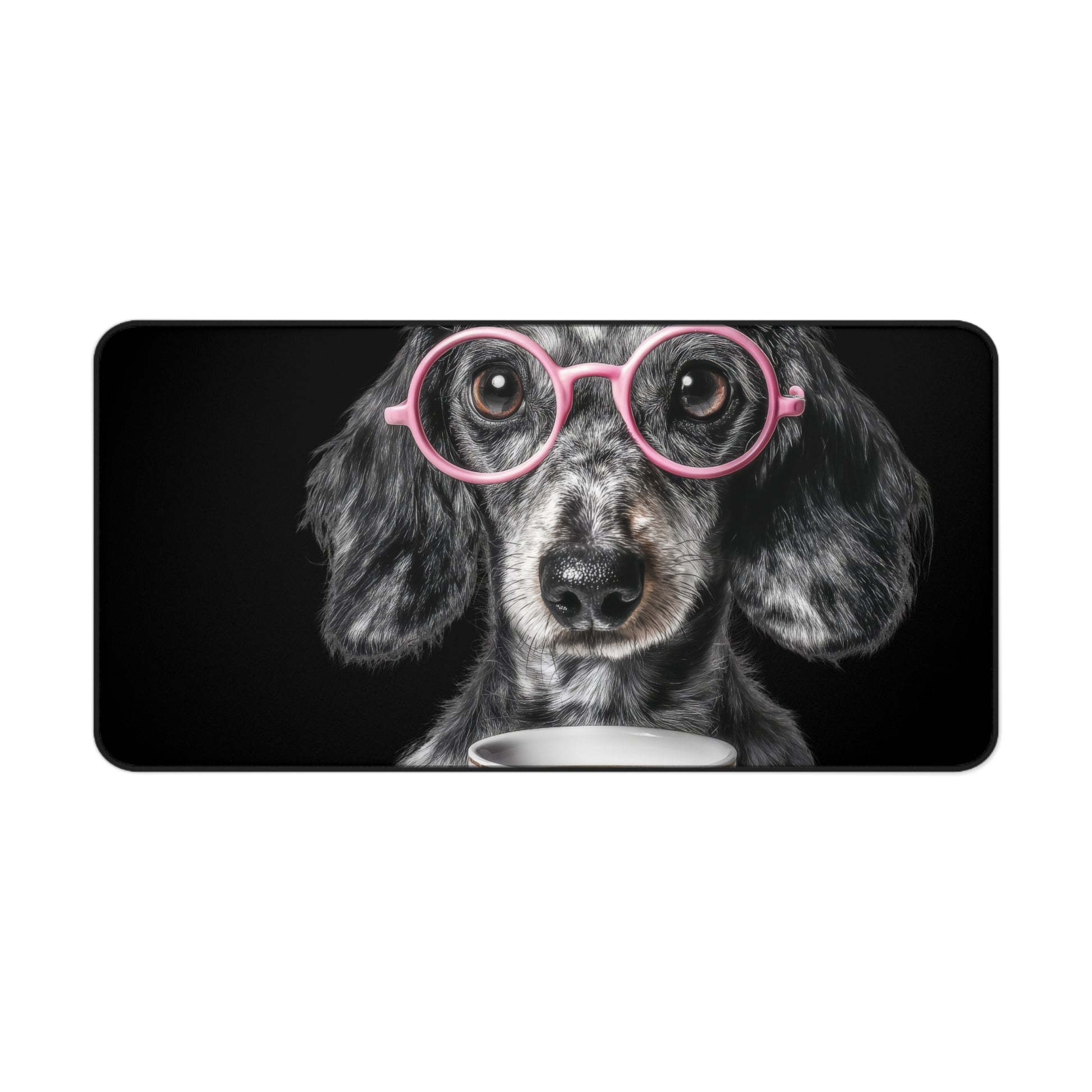 Bring a little daily delight to your workspace with this playful neoprene desk mat. A soft dachshund portrait wearing pink glasses peeks over a coffee mug against a deep black background — a quiet, charming companion during early mornings, late-night projects, or slow afternoons. The smooth printed surface keeps colors bright and details crisp, while the cushioned neoprene base supports typing and writing. Hemmed edges add durability so the mat stays neat through everyday use. Set it under your keyboard, sketchbook, or craft station to add a touch of warmth and humor to work sessions and cozy home-office corners.