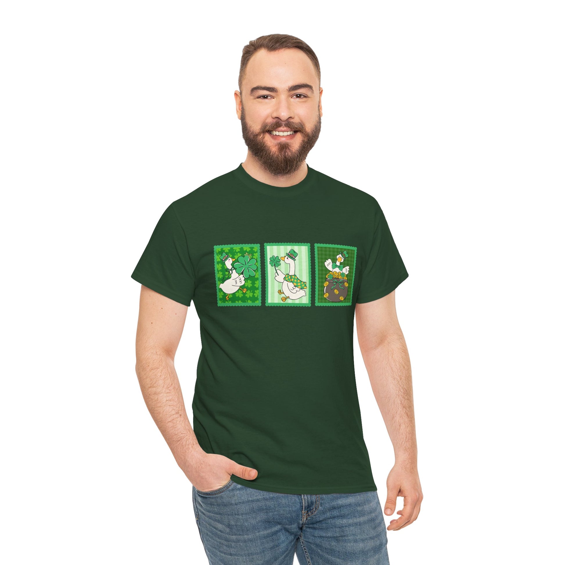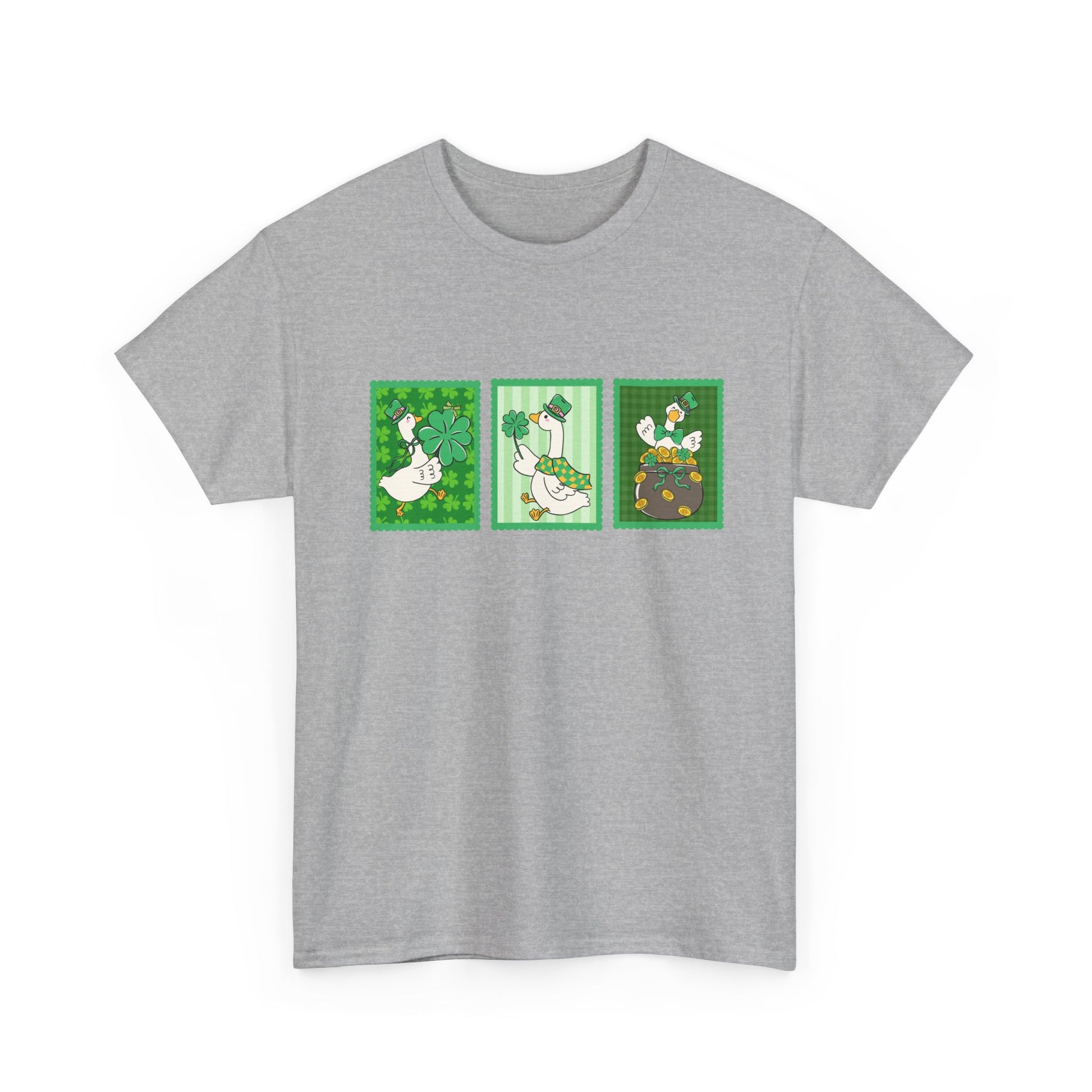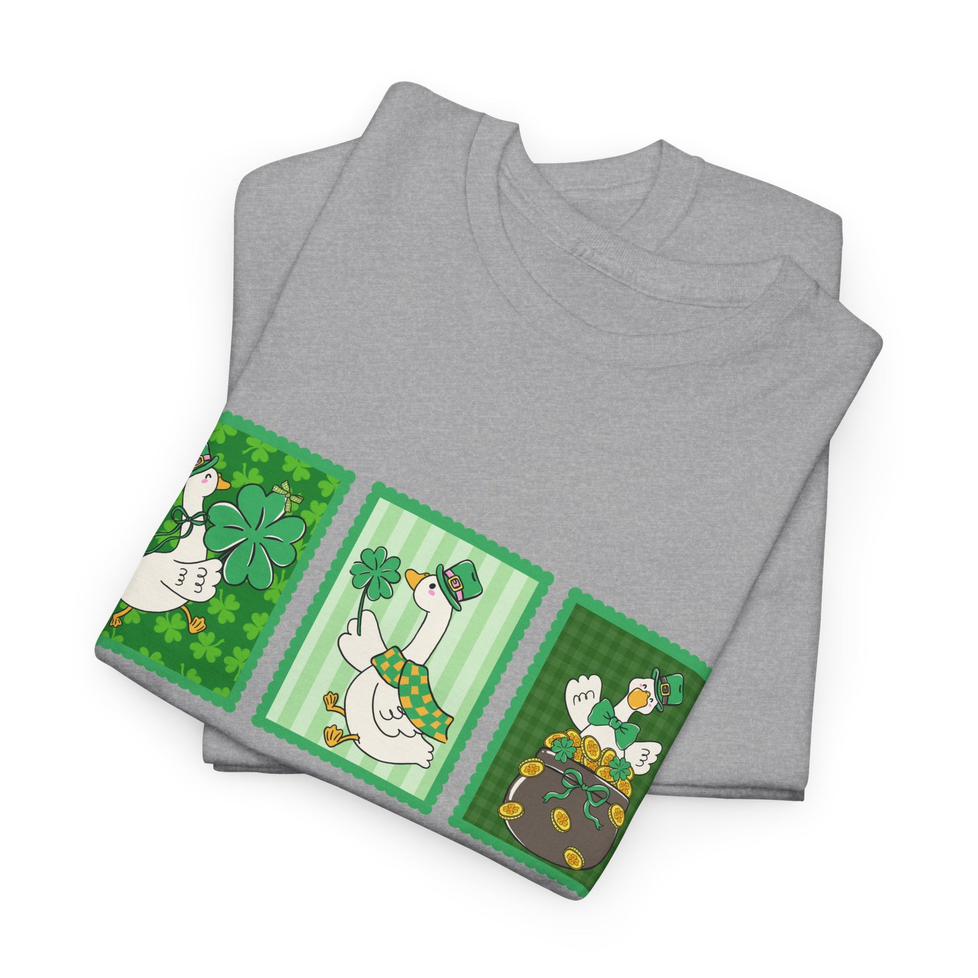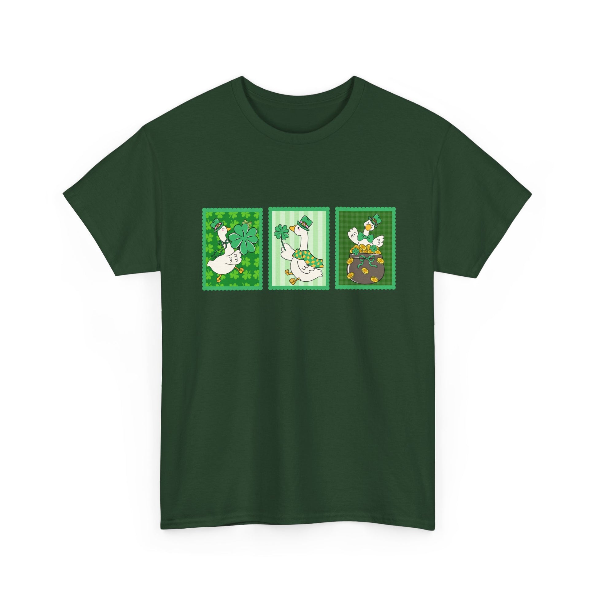 This soft, breathable tee carries a quiet, green-hearted charm—three small panels across the chest showing cozy woodland scenes with gentle ducks and leafy frames. The shirt feels like a slow morning walk through a sun-dappled garden: calming, familiar, and a little whimsical. It slips easily into everyday life—layer it under a cardigan, wear it with worn jeans, or keep it as your go-to for low-key gatherings. The subtle artwork gives off a cottagecore, nature-loving vibe that comforts without shouting, and the relaxed crew silhouette keeps the focus on comfort and that tiny, thoughtful illustration.