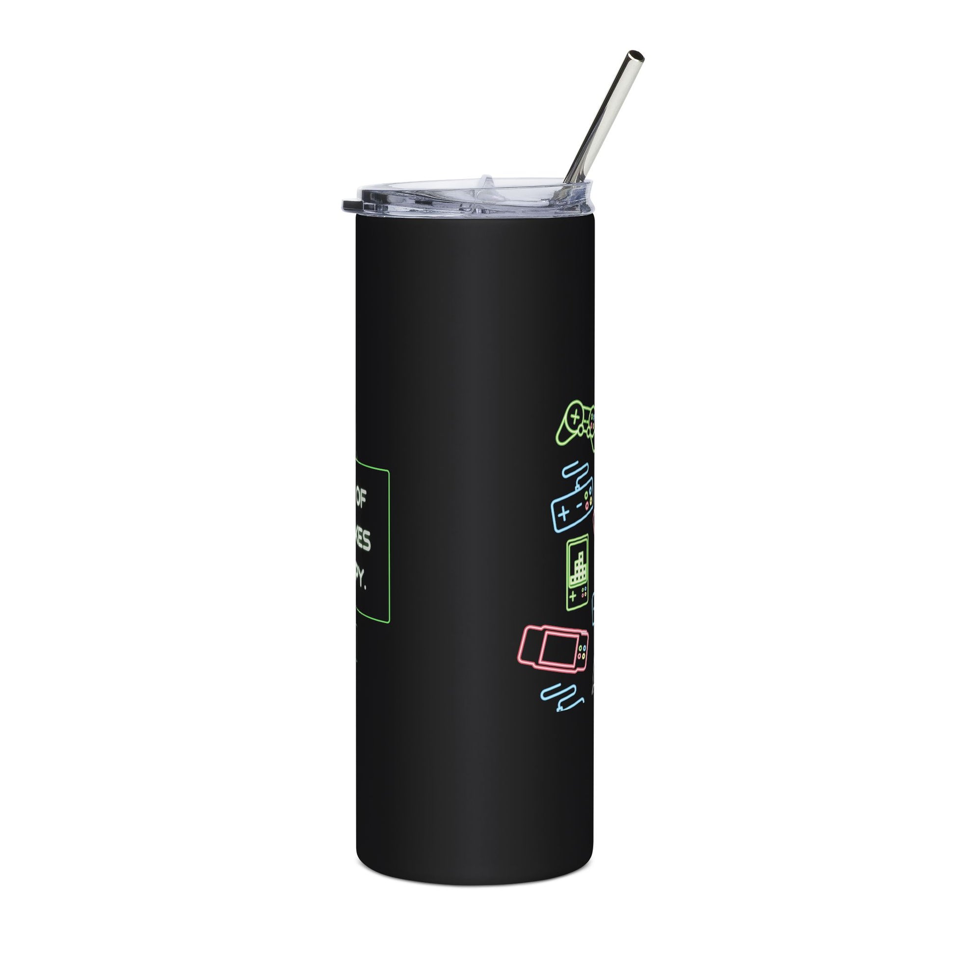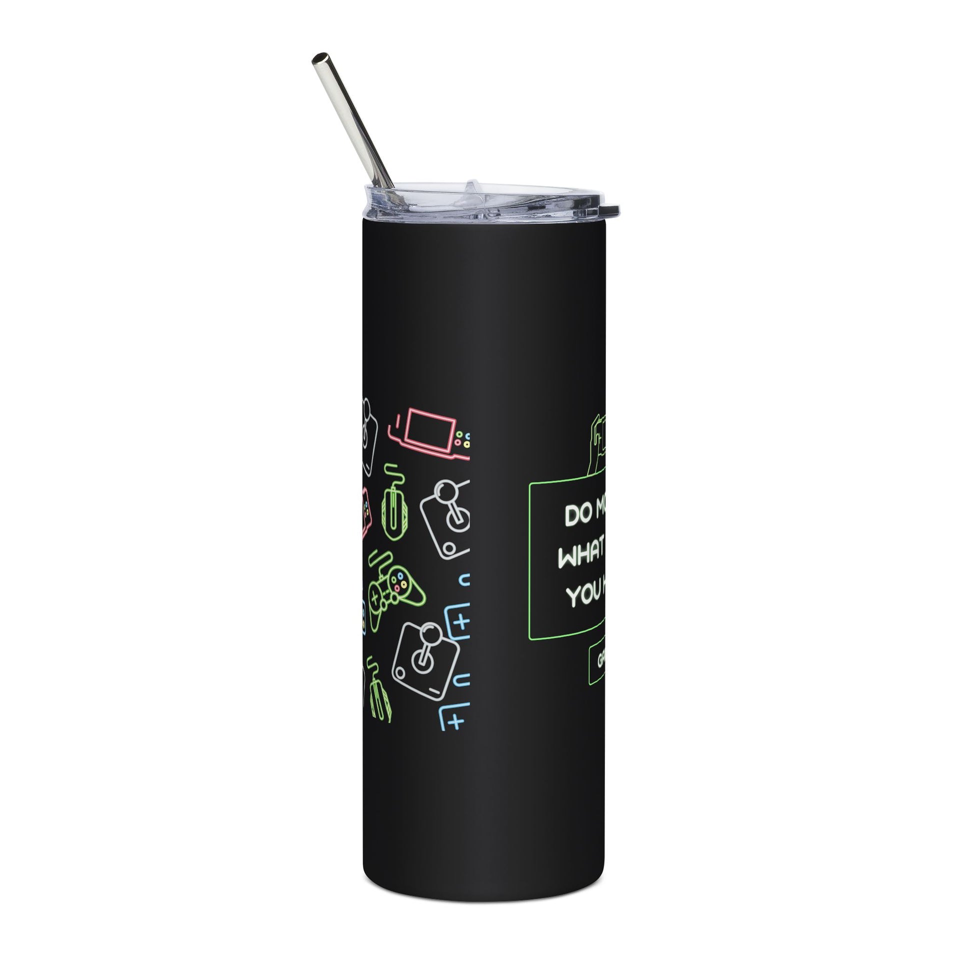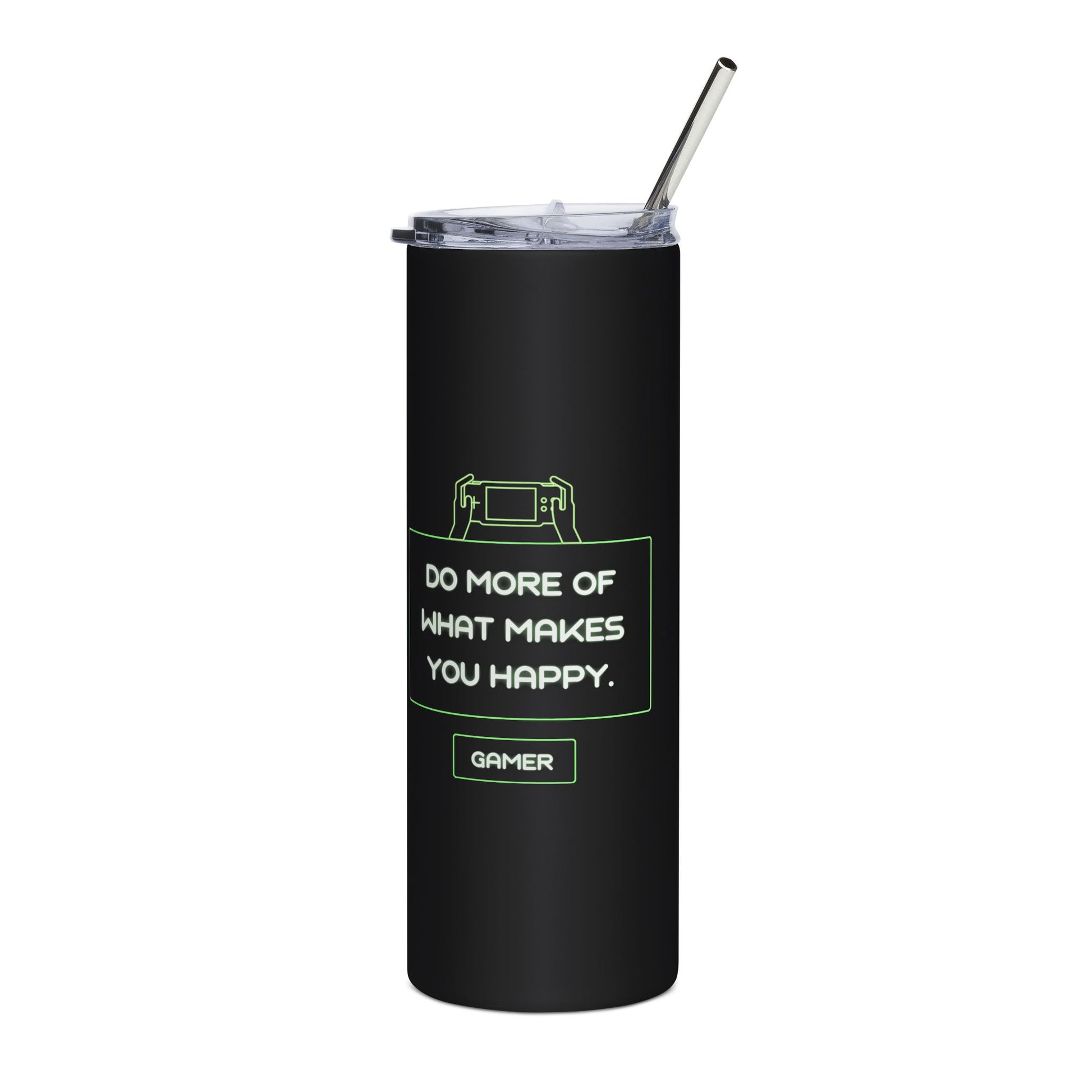Slim 20oz stainless steel tumbler with a sleek matte-black body and glossy protective finish. Neon-accent gamer graphics wrap the full 360 printable area, featuring a retro controller and the encouraging phrase “Do more of what makes you happy.” Comes with a clear lid and reusable stainless straw, sized to slip into cup holders and backpacks. It’s light enough for daily carry, sturdy enough for long gaming sessions, and finished to keep the design bright through regular use.