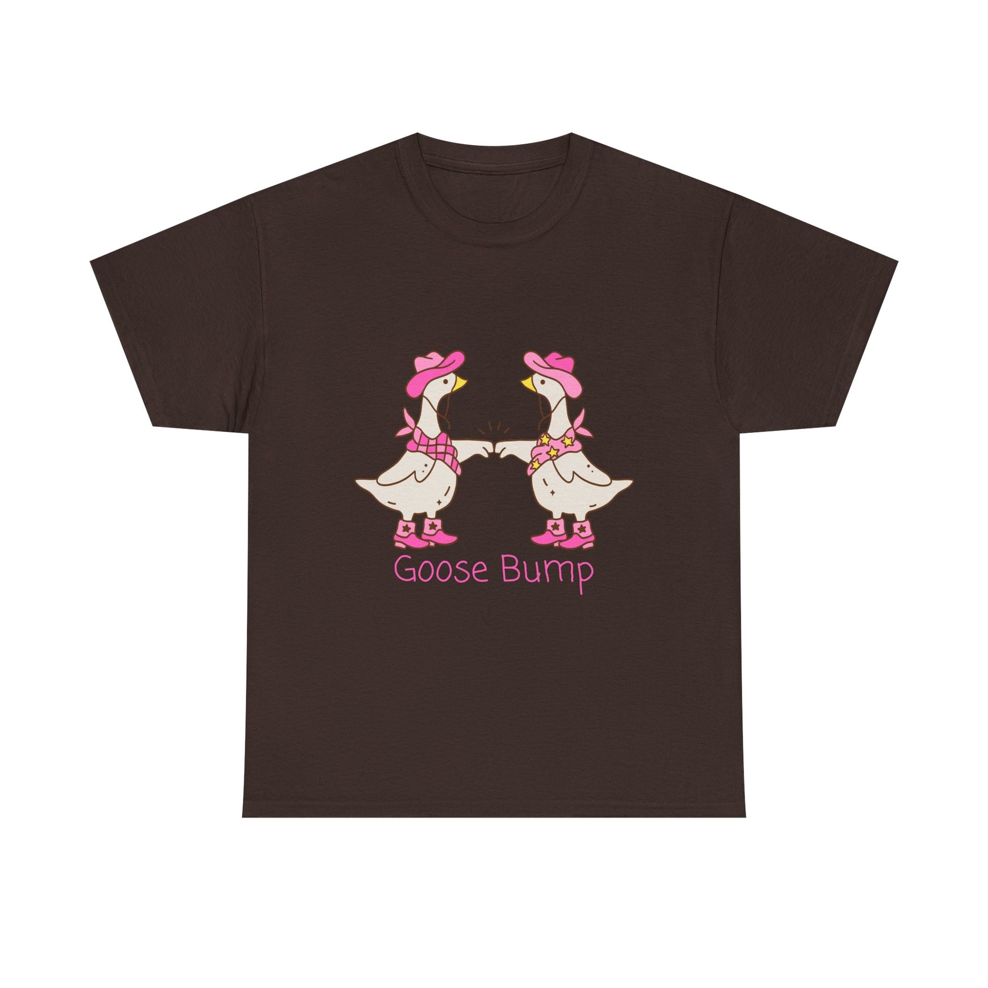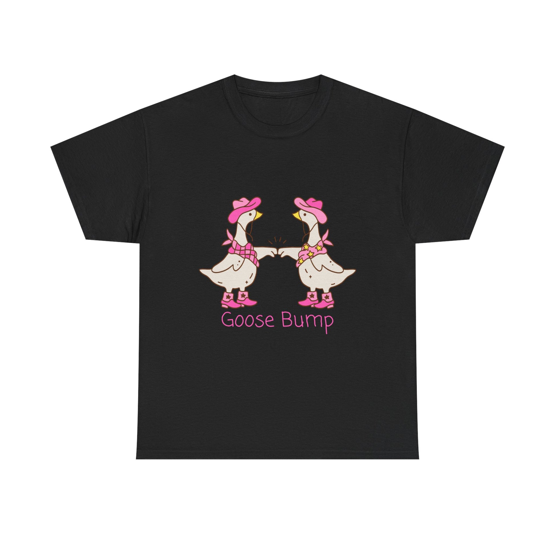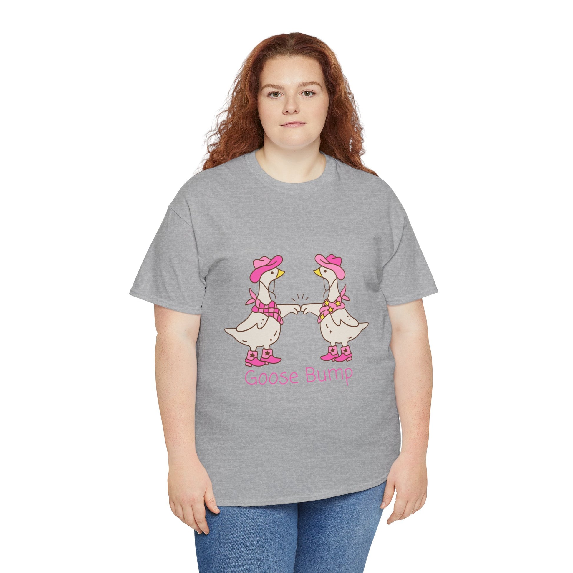 This soft, classic tee carries a playful, homespun charm. Two cartoon geese in pink hats and roller skates bump wings across the chest, with the whimsical caption “Goose Bump” below. The light-hearted illustration brings a warm, humorous vibe—like a sunny afternoon at a small-town fair or a cozy coffee chat with a friend. It sits comfortably in casual wardrobes: worn with jeans for weekend errands, layered under an open shirt for a quirky pop of personality, or pulled on for relaxed playdates and community events. The relaxed cut and breathable cotton feel effortless and familiar, while the hand-drawn look of the design invites smiles and conversation wherever it goes.