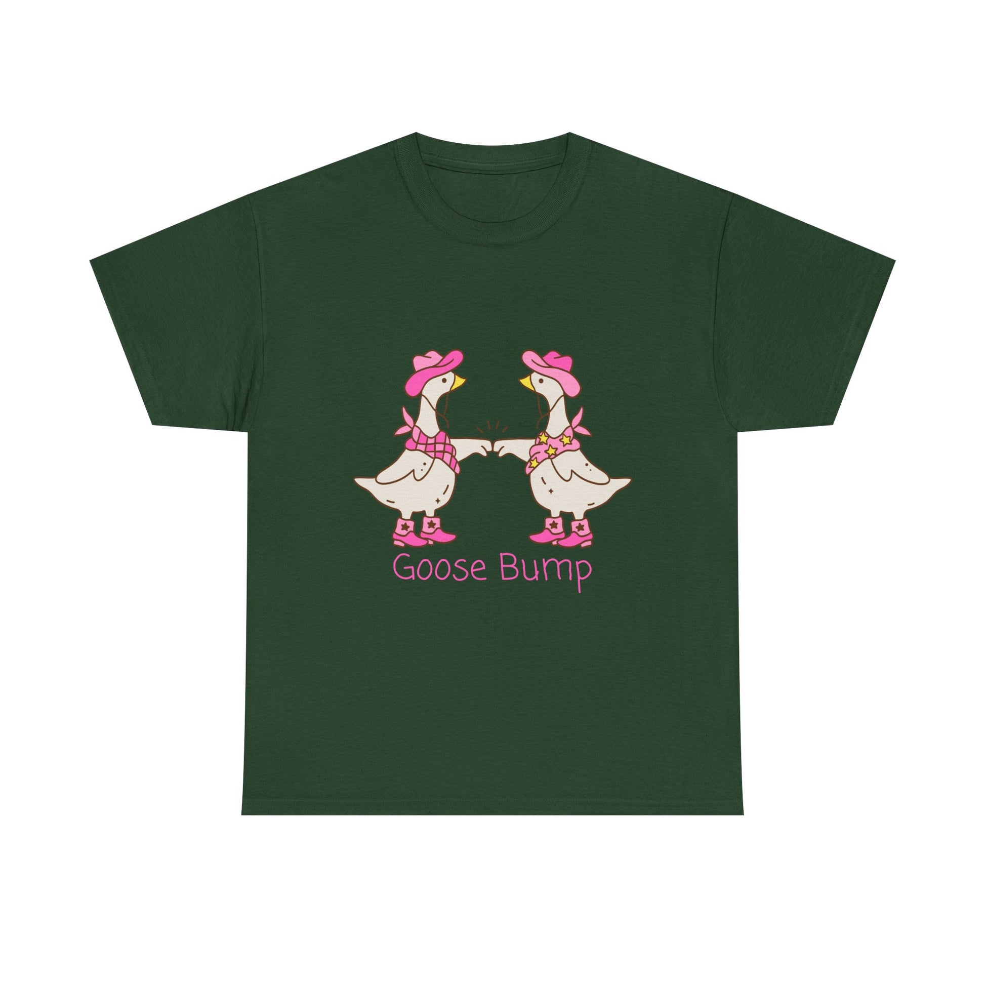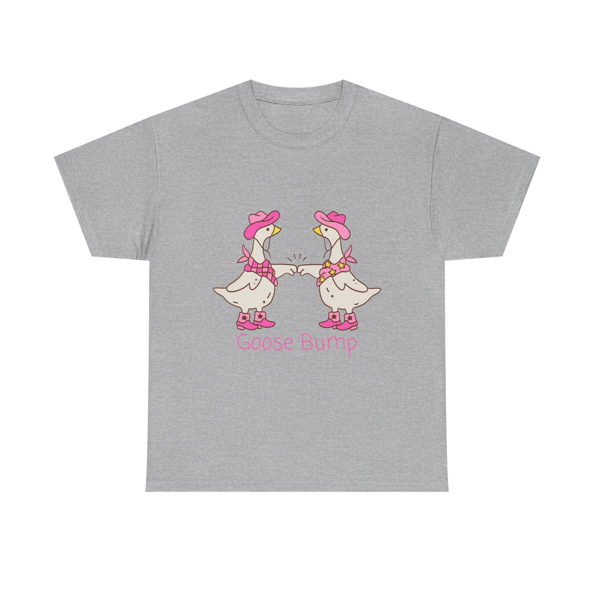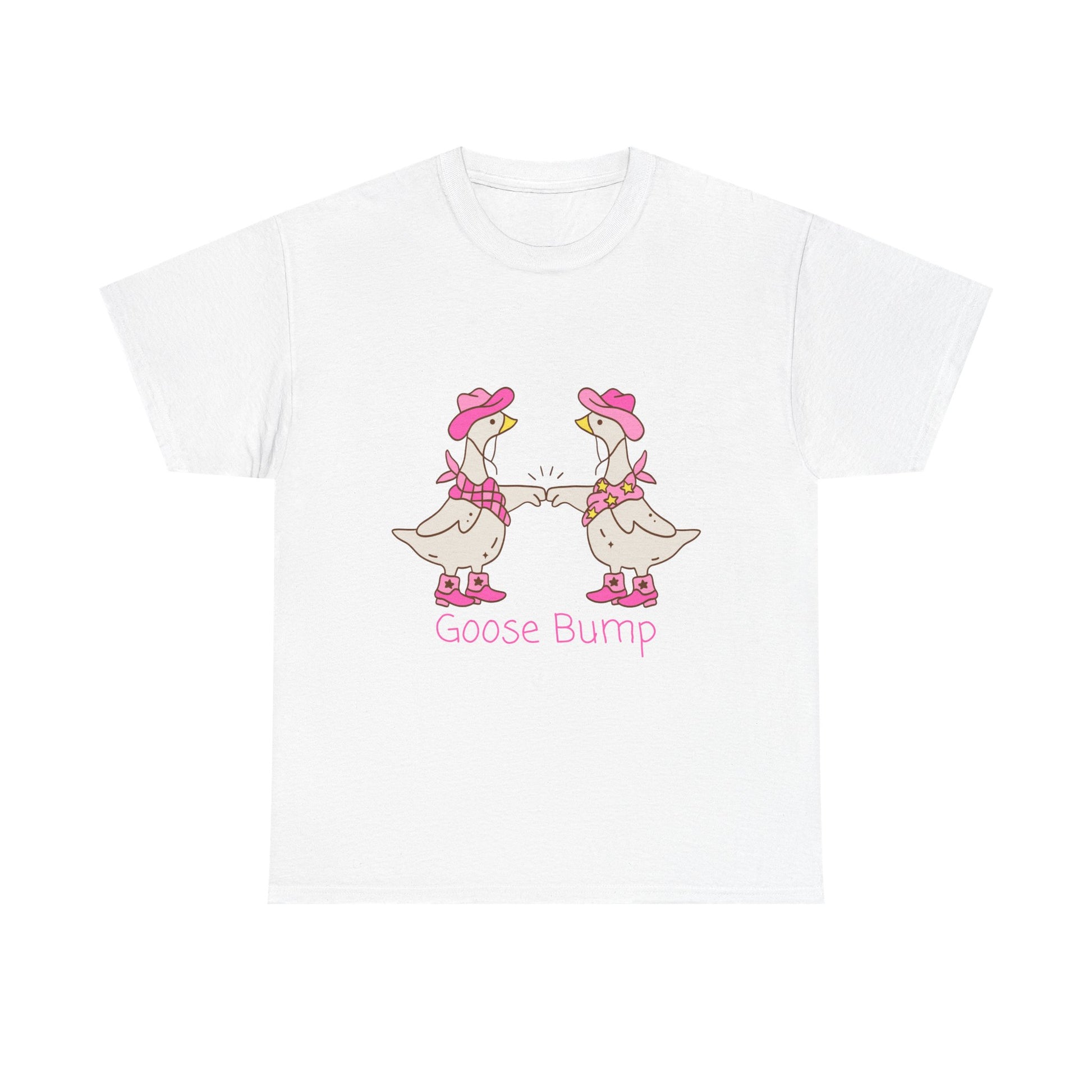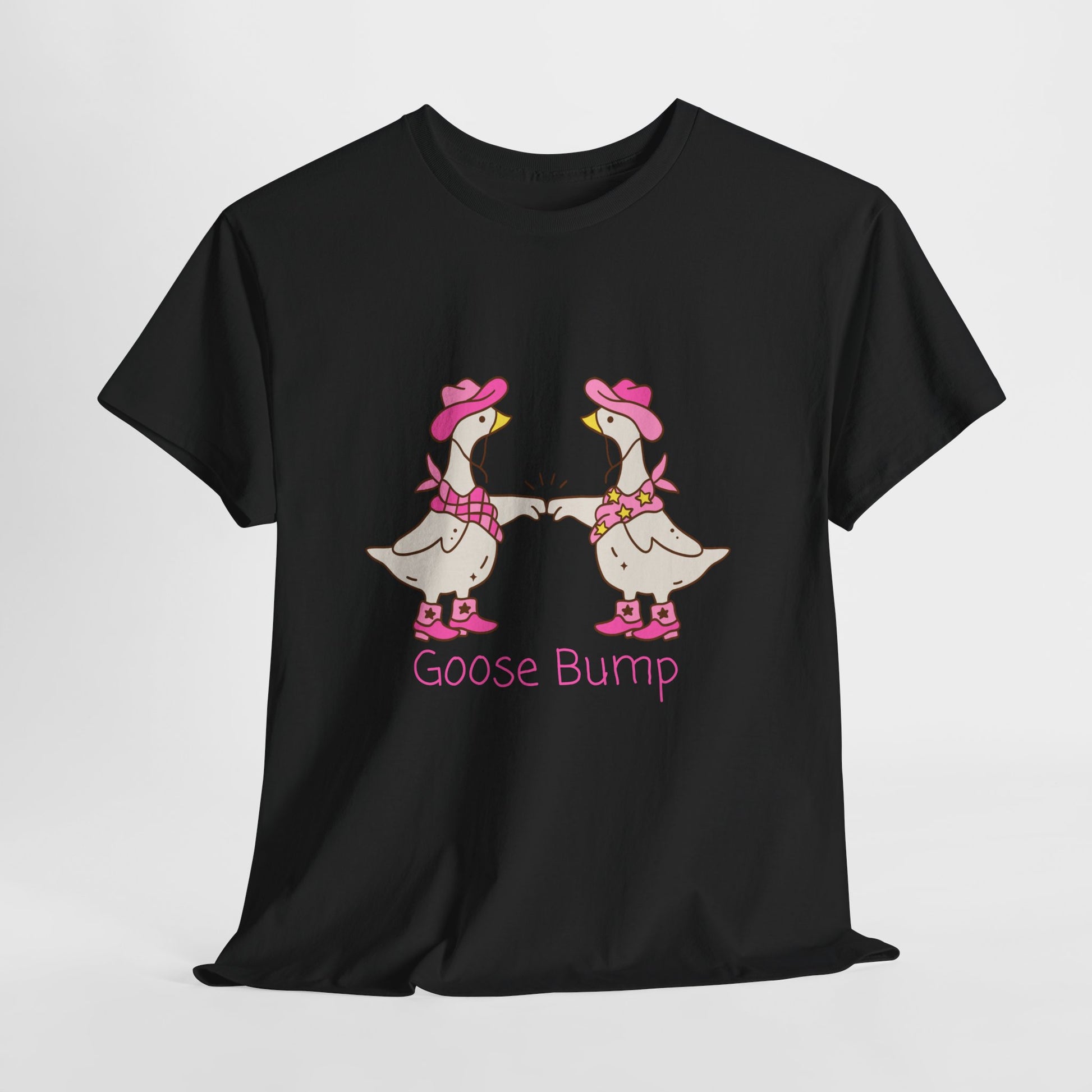 This soft, classic tee carries a playful, homespun charm. Two cartoon geese in pink hats and roller skates bump wings across the chest, with the whimsical caption “Goose Bump” below. The light-hearted illustration brings a warm, humorous vibe—like a sunny afternoon at a small-town fair or a cozy coffee chat with a friend. It sits comfortably in casual wardrobes: worn with jeans for weekend errands, layered under an open shirt for a quirky pop of personality, or pulled on for relaxed playdates and community events. The relaxed cut and breathable cotton feel effortless and familiar, while the hand-drawn look of the design invites smiles and conversation wherever it goes.
