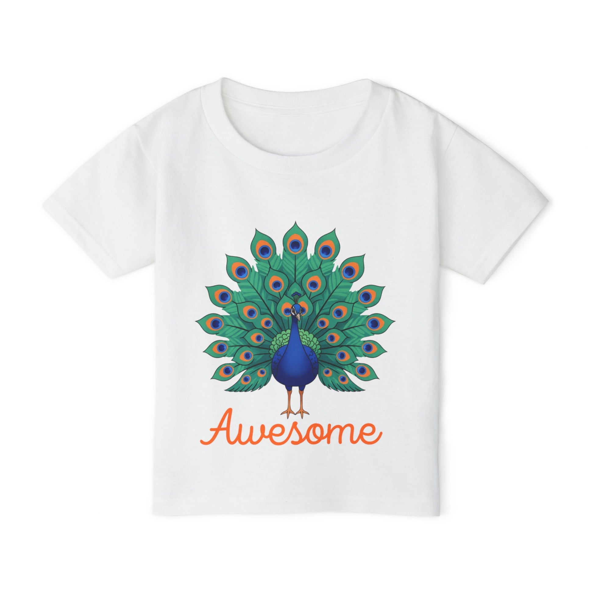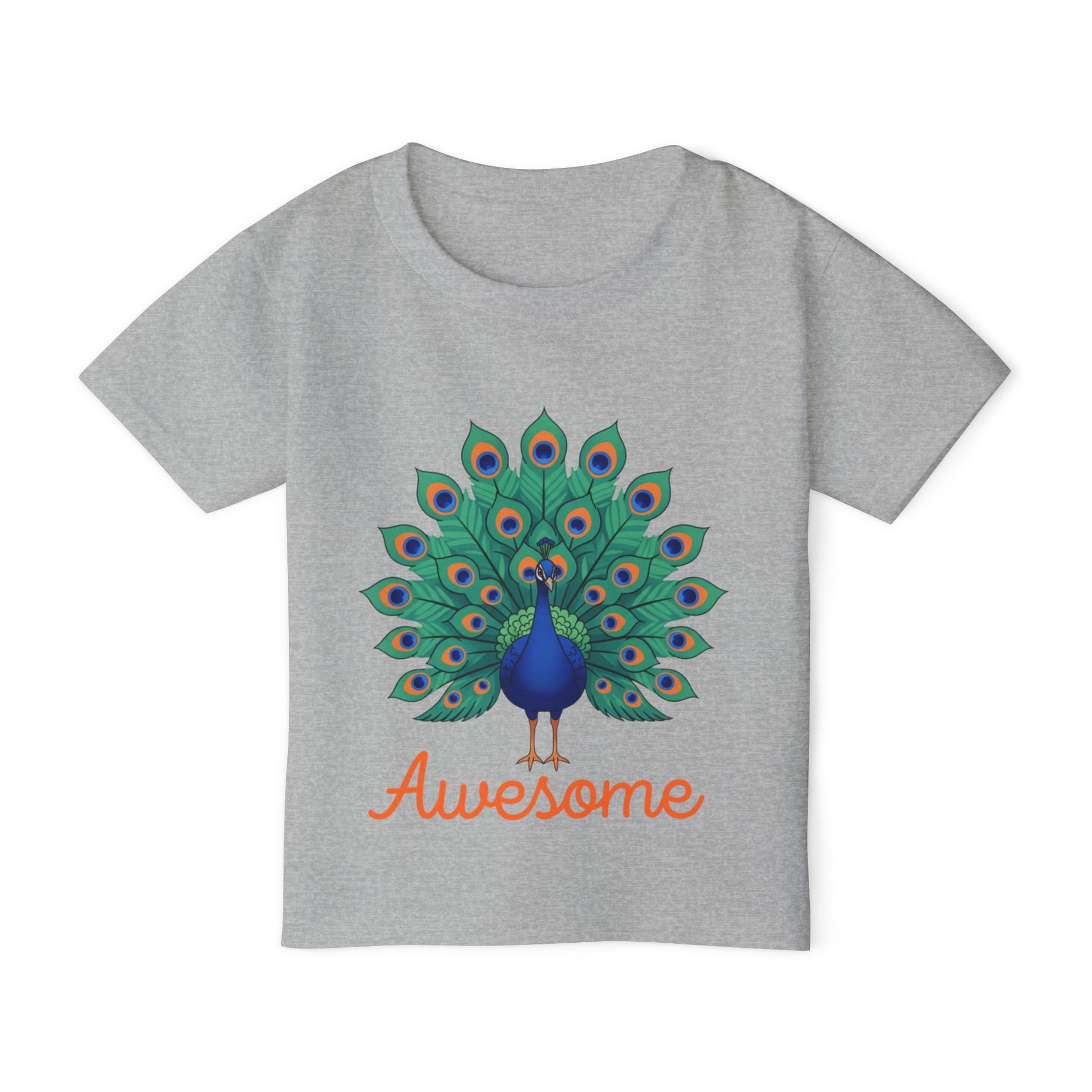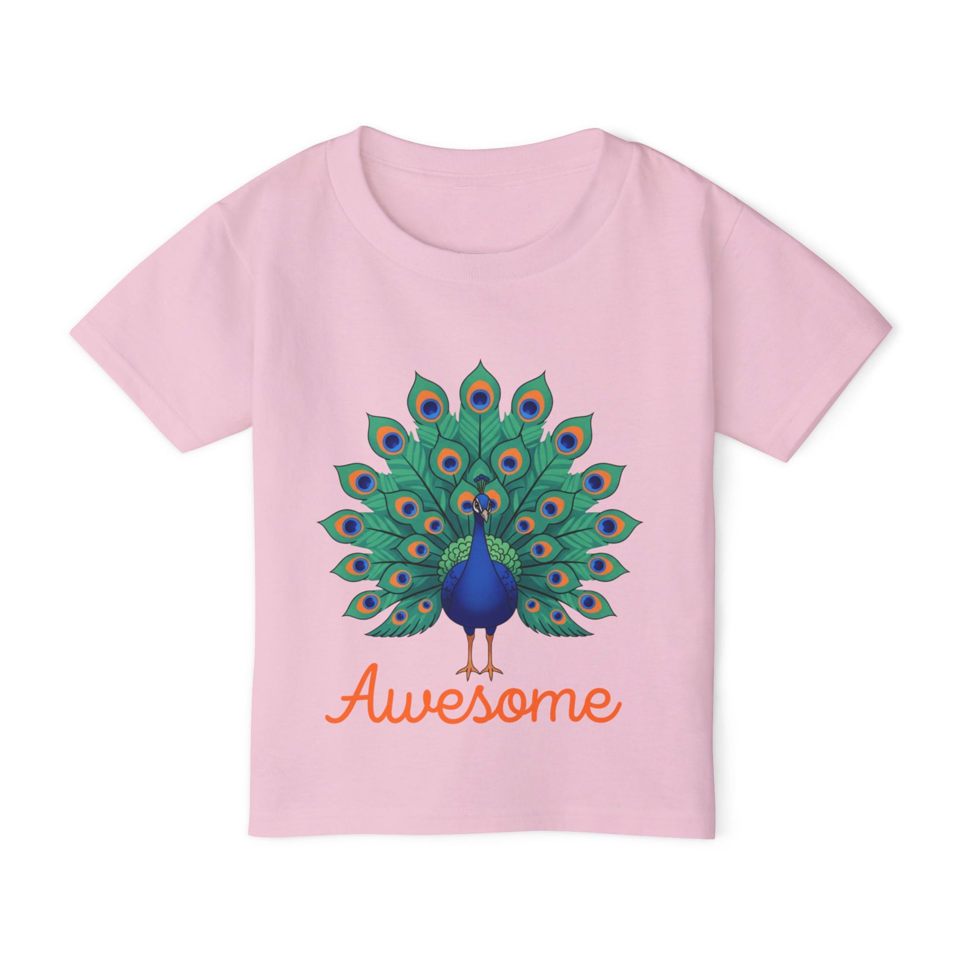 Bright, playful, and full of personality — this toddler tee brings a proud peacock front and center. Soft, medium-weight cotton keeps little ones comfortable while the vibrant tail and cheerful “Awesome” script add a burst of color to everyday play. The classic cut and reliable construction make it easy to layer under sweaters or wear alone for park days, preschool mornings, or family photos. It settles into active routines without losing shape, and the tear-away label prevents irritation so focus stays on fun — not fuss.