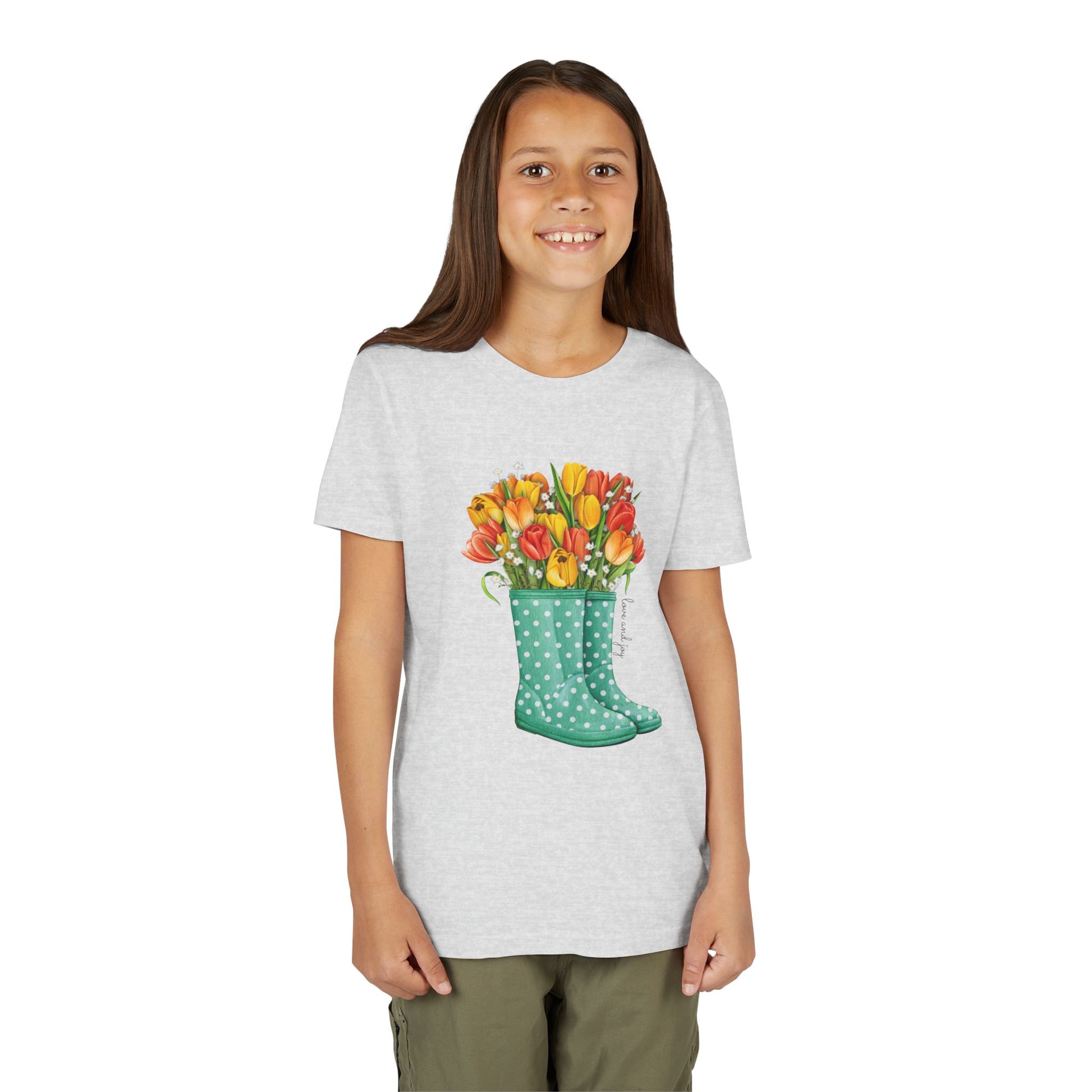 Sunlit spring days captured in a kid-sized tee: cheerful tulips tucked into mint-green polka-dot rain boots make this soft tee feel like puddle-jumping mornings and backyard bouquets. Lightweight airlume-combed cotton keeps active little ones comfortable while the retail fit and crew neckline hold a neat, modern shape. The artwork sits bright and centered so every run, splash, or garden adventure looks joyful and fresh. Ethically made blanks and tag-free comfort mean fuss-free wear for both kids and caretakers.